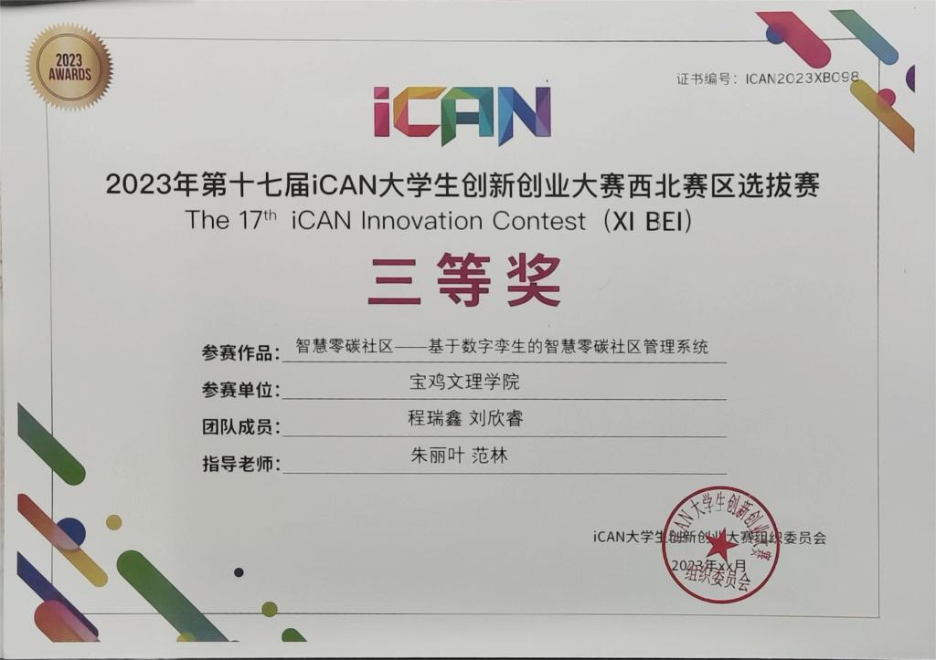 12月24日,第十七届iCAN老员工创新创业大赛全国总决赛在北京奥林匹克塔落下帷幕。在西北赛区的比赛中,政法公司2021级行政管理专业员工程瑞鑫、刘欣睿的参赛作品《智慧零碳社区——基于数字孪生的智慧零碳社区管理系统》获得三等奖,指导教师为政法公司四为创新创业团队导师朱丽叶、范林。