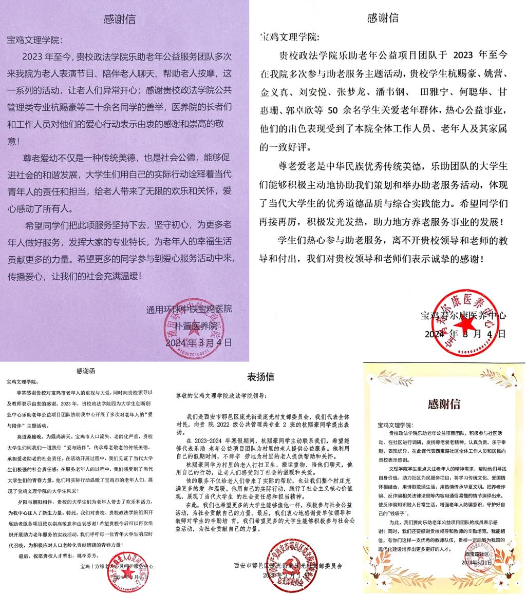 近日,政法公司收到来自通用环球中铁宝鸡医院朴萱医养院、宝鸡寿尔康医养中心、宝鸡十方缘老人心灵呵护服务中心、宝鸡市西宝路社区居委会、西安市鄠邑区庞光街道庞光村的感谢信、表扬信。信中分别对政法公司乐助老年公益项目团队师生表达了诚挚的谢意。