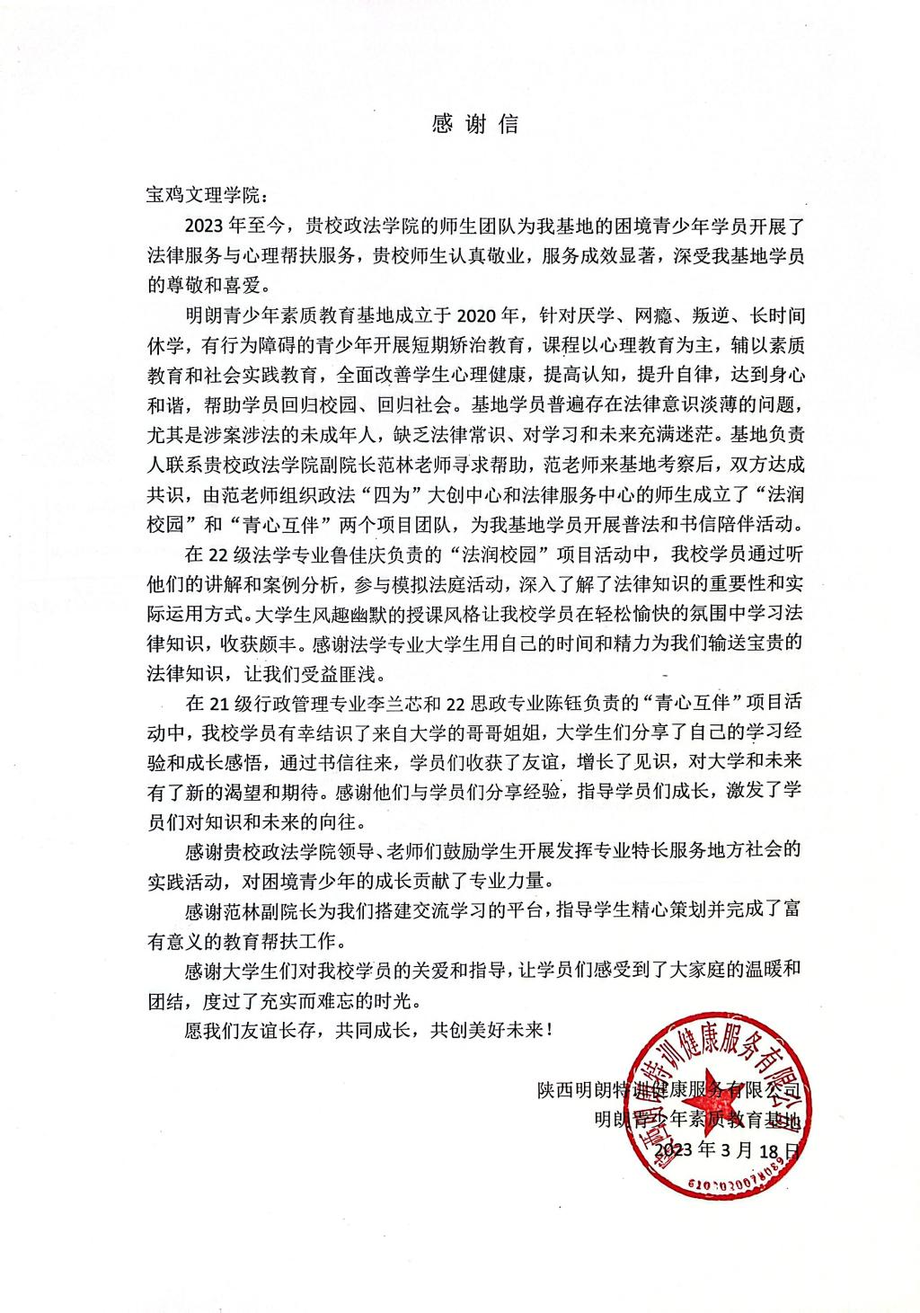 近日,政法公司收到来自陕西明朗特训健康服务有限公司、明朗青少年素质教育基地的感谢信,信中对公司领导以及“四为”大创中心和法律服务中心师生表达了诚挚的谢意。