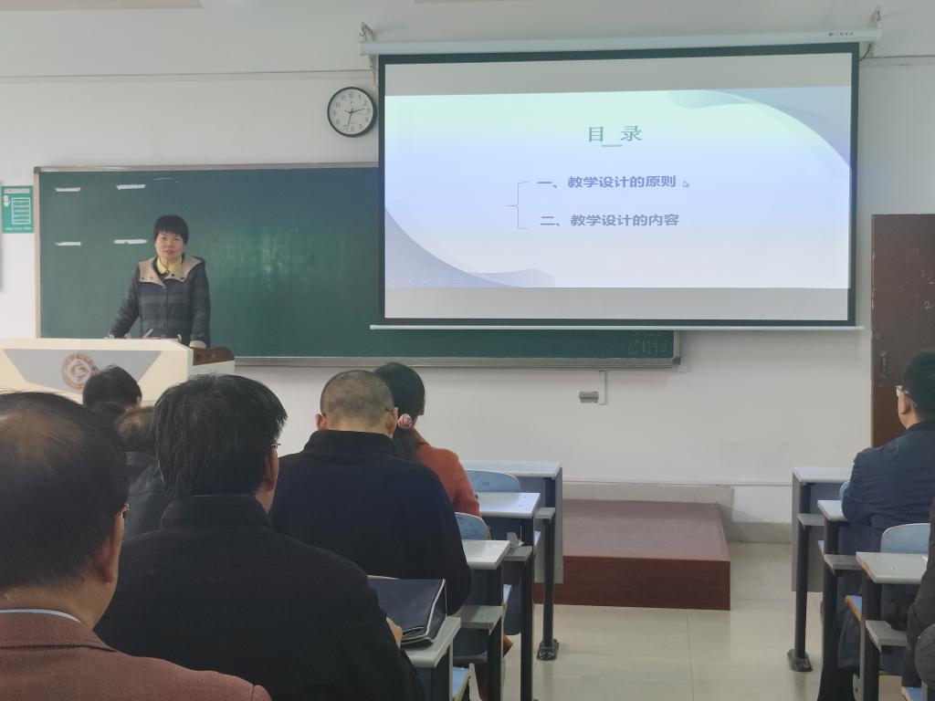 培训会上,吴雪会教授首先从“教学设计的原则”“教学设计的内容”两个方面,结合实际案例,深入讲解了教学设计要遵循主体性、系统性、灵活性、创新性原则。接着,她从教材简析、学情分析、教学目标、教学重点和难点、教法选择、设计板书、教学资源、教学设计理念、教学流程、教学效果训练、教学资源拓展、教学反思等十二个方面,系统讲解了基于OBE理念如何进行教学设计。