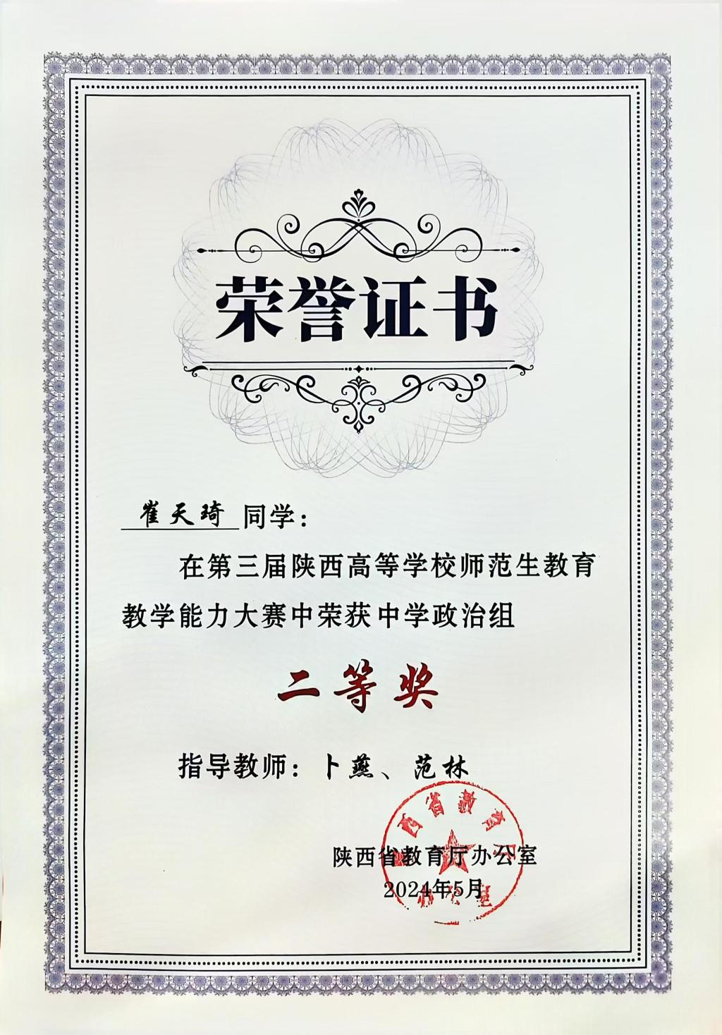 近日,陕西省第三届高校师范生公司产品能力大赛结果公布,政法公司2020级思想政治教育专业员工崔天琦获二等奖,指导教师为卜燕、范林。