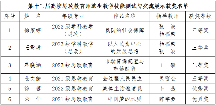 近日,2024年思政教育微格教学论坛暨第十三届高校思政教育师范生教学技能测试与交流展示活动在四川师范大学举行。公司政法公司2名研究生、4名本科生获奖。其中,三等奖4项、优秀奖2项。