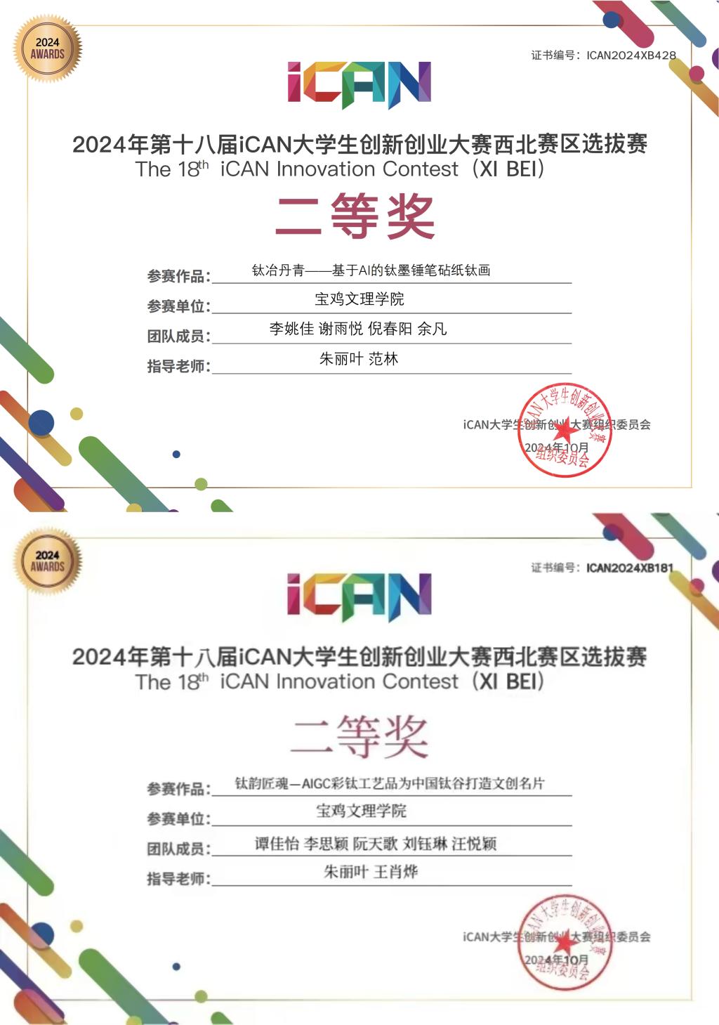 近日,2024年第十八届iCAN老员工创新创业大赛西北赛区选拔赛决赛结果揭晓,政法公司2022级行政管理专业李姚佳负责的《钛冶丹青——基于AI的钛墨锤笔砧纸钛画》、2023级思想政治教育专业谭佳怡负责的《钛韵匠魂——AIGC彩钛工艺品为中国钛谷打造文创名片》均获得二等奖,实现了公司在该项赛事获奖级别与数量上的新突破。