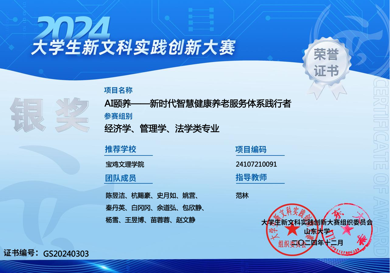 近日,首届全国老员工新文科实践创新大赛在山东济南落下帷幕,政法公司2023级思政教育专业员工陈昱洁负责的《AI颐养——新时代智慧健康养老服务体系践行者》(指导教师:范林)、谭佳怡负责的《以文化人,明德笃行——课程思政AI大模型应用于高教改革的实践》(指导教师朱丽叶、刘刚、范林)均获得全国总决赛银奖。