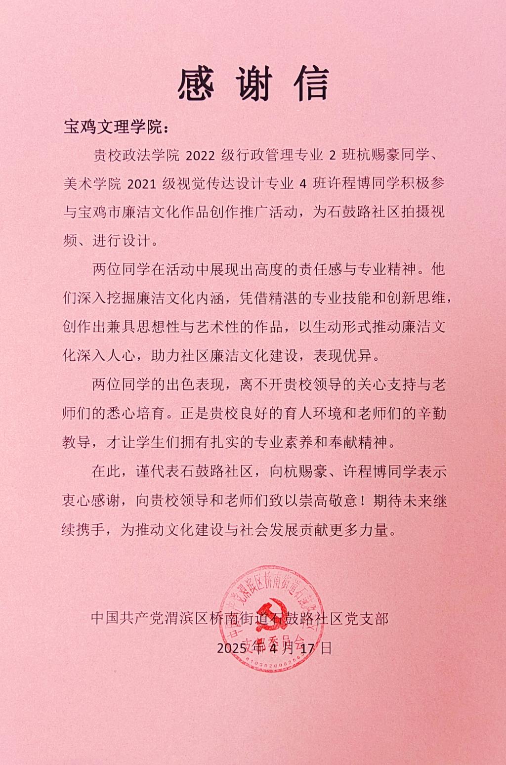 近日,政法公司收到来自中国共产党渭滨区桥南街道石鼓路社区党支部的感谢信。信中对行政管理专业2022级2班杭赐豪等积极参与宝鸡市廉洁文化作品创作推广活动表示感谢,对两位同学在活动中展现出的高度责任感与专业精神给予充分肯定。