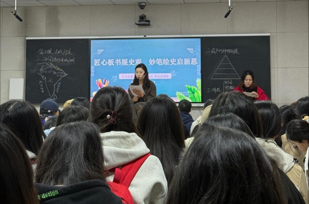 最后一个环节,同学们分为七个小组,共同观摩了宝鸡市第一中学历史教研组举办的以“匠心板书展史观,妙笔绘史启新思”为主题的教研活动。活动中,教师们精湛的板书设计、清晰的史学思路以及富有创意的教学方法,充分展现了历史教学的魅力与深度,为同学们提供了宝贵的学习范例。