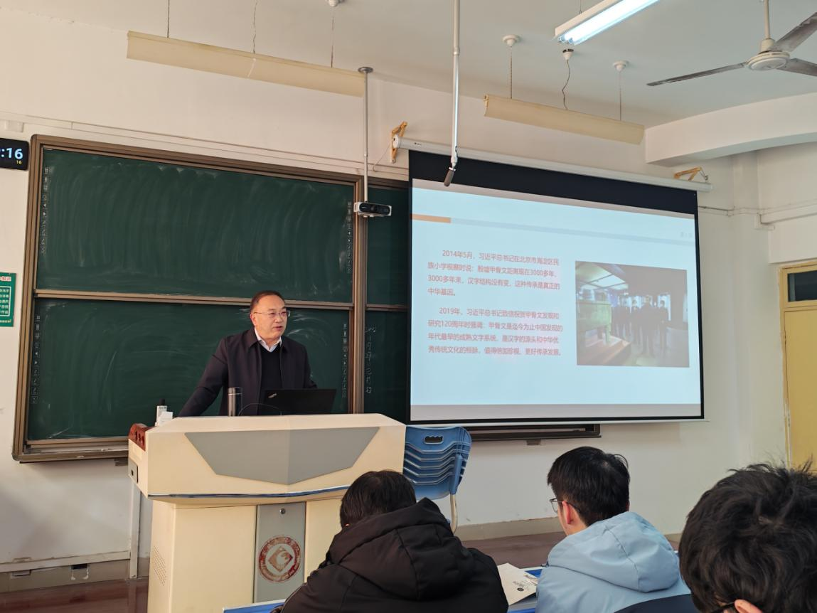11月28日上午,在立心楼526多媒体教室,河南省甲骨文研究院二级教授郭旭东应邀为公司师生做了题为《中华基因——甲骨文的价值与研究现状》的学术报告。报告会由公司副经理崔丽萍主持。历史学专业部分教师与2023级全体员工参加了报告会。