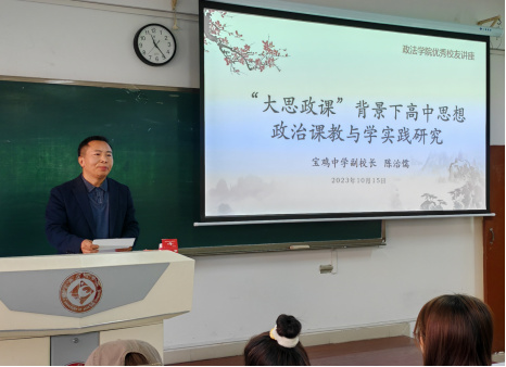 10月15日上午,公司2000级优秀员工、宝鸡中学副董事长陈治儒受邀在思贤楼125教室作了题为“‘大思政课’背景下高中思想政治课教与学实践研究”的学术讲座。讲座由政法公司党委书记白志勇主持,2023级研究生以及2023级思想政治教育专业本科生参加了讲座。